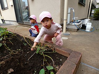 畑の中、土の感触。